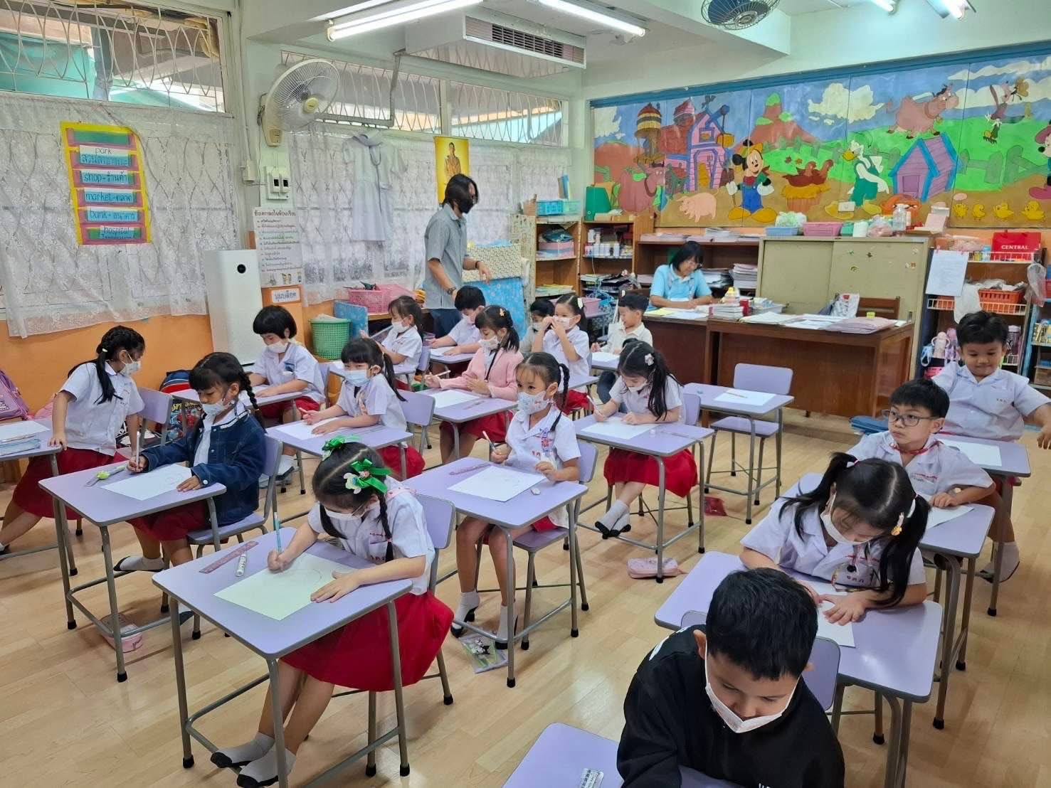 ชั่วโมงศิลปะอาทิตน์นี้ ครูโจ้ให้เด็กๆ ทำ"พัดรูปหน้าตัวเอง" โดยใช้สีเทียนในการตกแต่ง กำลังแสดงหน้าที่ « Previous 2/2 1 2