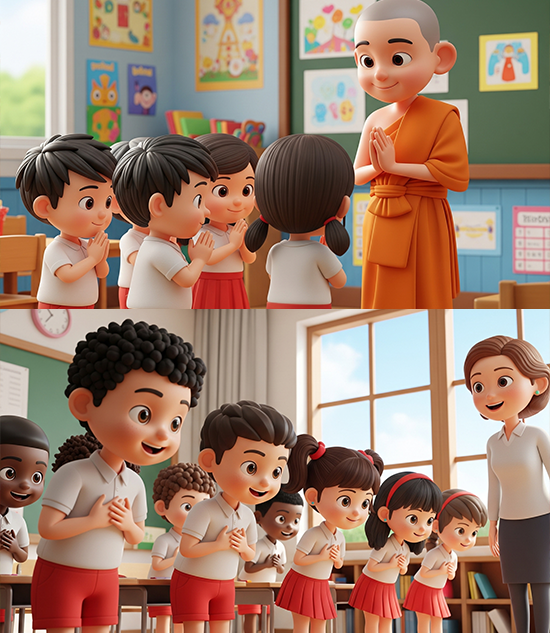 สร้างด้วยปูนและไม้ มีหินล้างเป็นบางส่วน เดิมประกอบด้วยห้องเรียน 4 ห้อง มีห้องสมุด 1 ห้อง ห้องนอนรวมใหญ่ 1 ห้อง และห้องเก็บของเล็ก 2 ห้อง มีโรงอาหารอยู่ใต้ห้องนอน...
