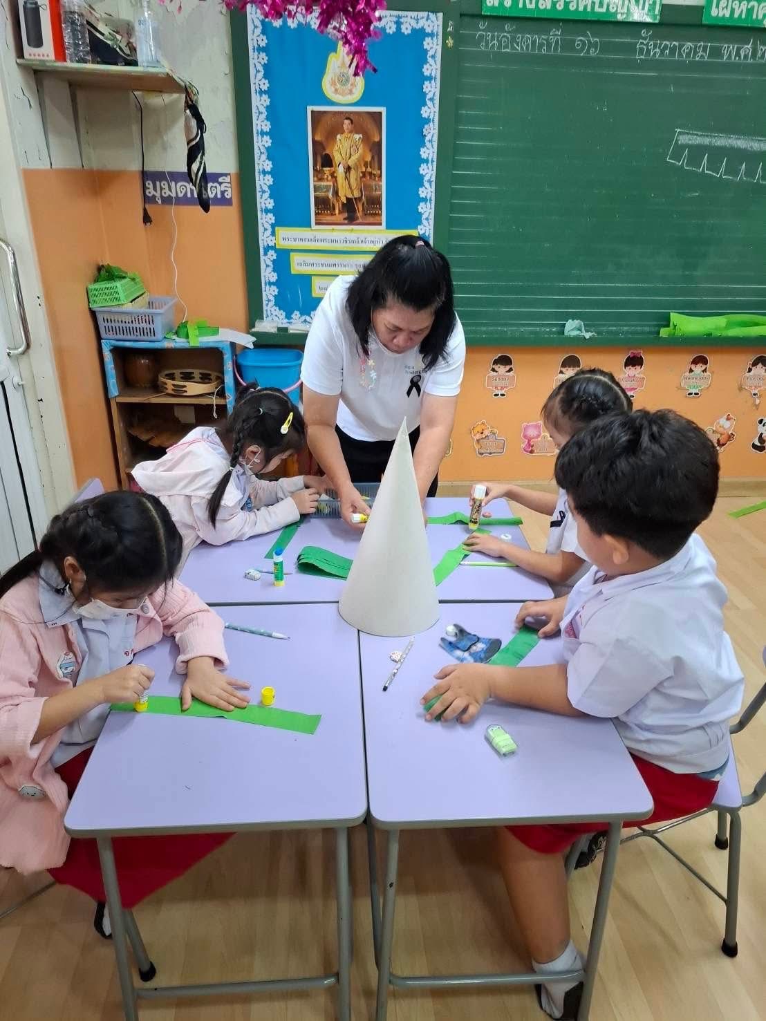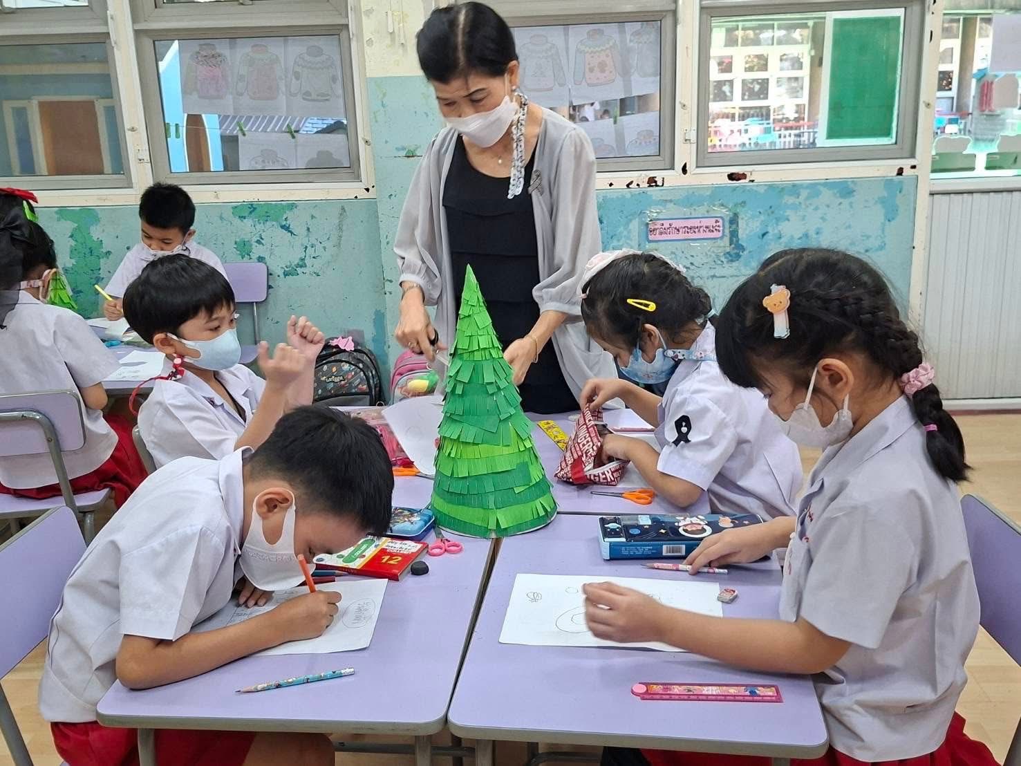 ชั่วโมงศิลปะอาทิตย์นี้ ครูโจ้ให้เด็กๆ แบ่งเป็นกลุ่ม ทำต้นคริสต์มาส โดยใช้สีไม้ในการตกแต่ง กำลังแสดงหน้าที่ « Previous 2/2 1 2