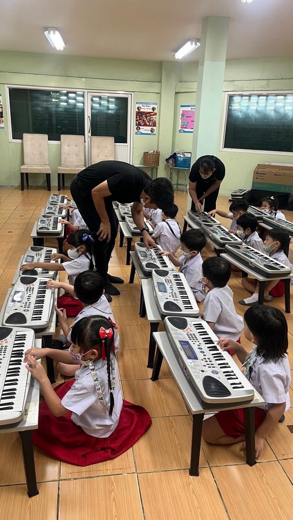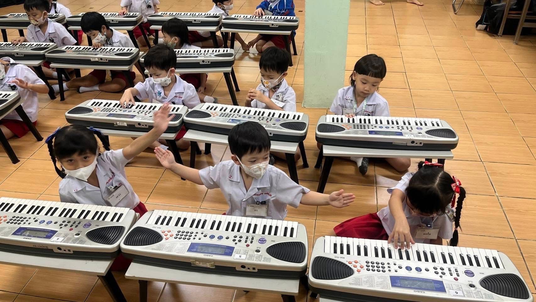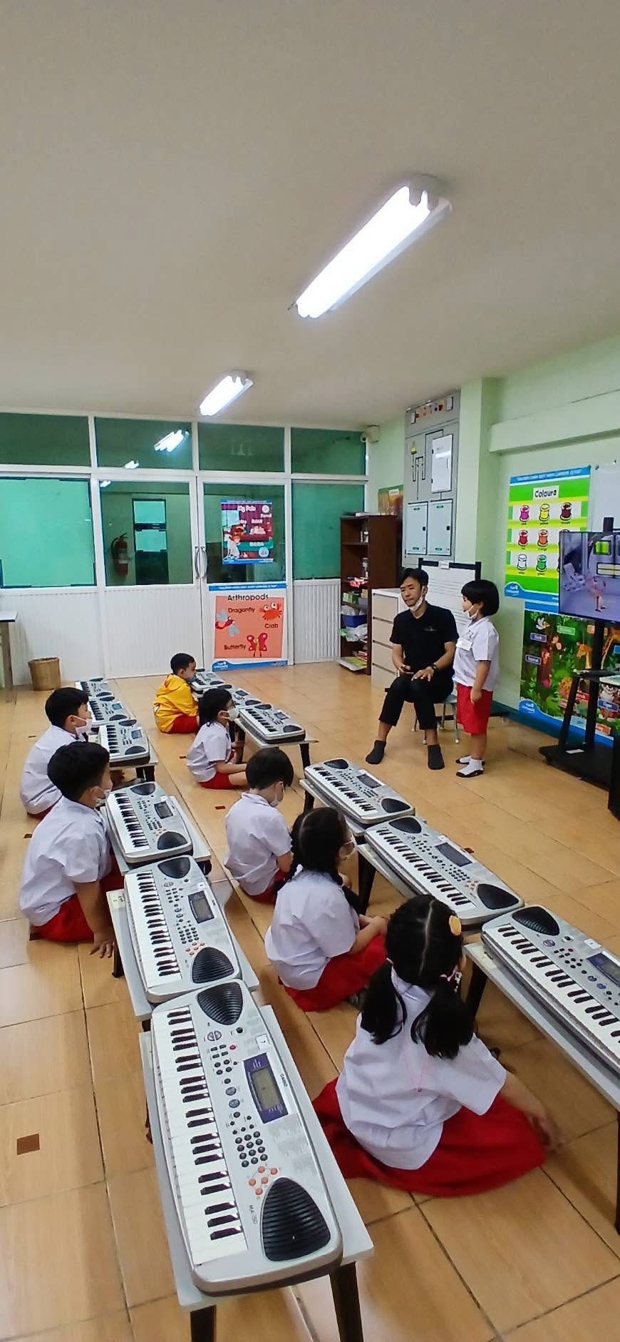-ฝึกร้องเพลงแนะนำชื่อนิ้วมือทั้ง 5 และทดลองเล่นคีย์บอร์ด เพื่อนำไปสู่การเรียนในระดับต่อไป