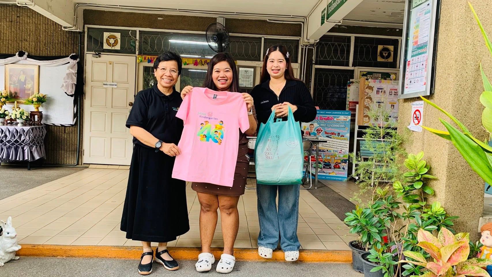คุณแม่น้องธันวา ชั้น อ.3/2 และครอบครัว ทำเสื้อลายนักเรียนจิดาภารุ่นที่ 40 มาให้คุณครู พี่เลี้ยง บุคลากร และนักเรียนชั้นอนุบาล 3 ทุกคน และนำสายสะพายและมงกุฎมาให้เด็กๆ ชั้นอนุบาล 3 ทุกคน ขอขอบพระคุณมากนะคะ กำลังแสดงหน้าที่ 1/1 1