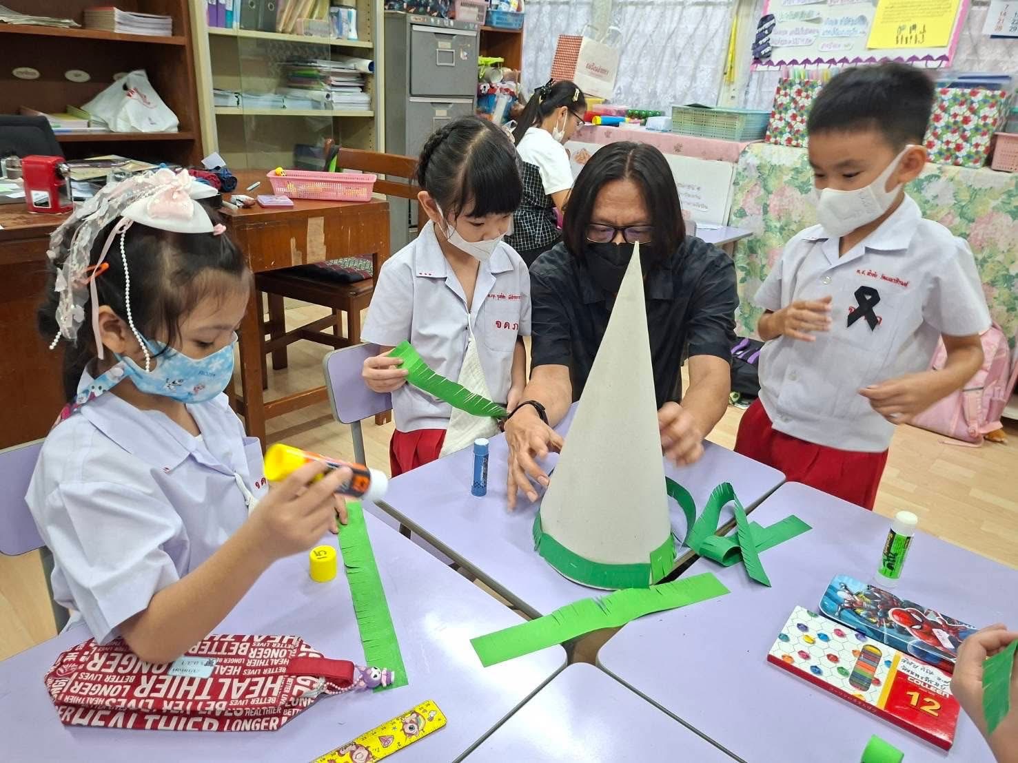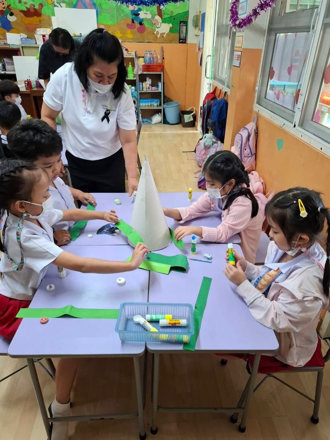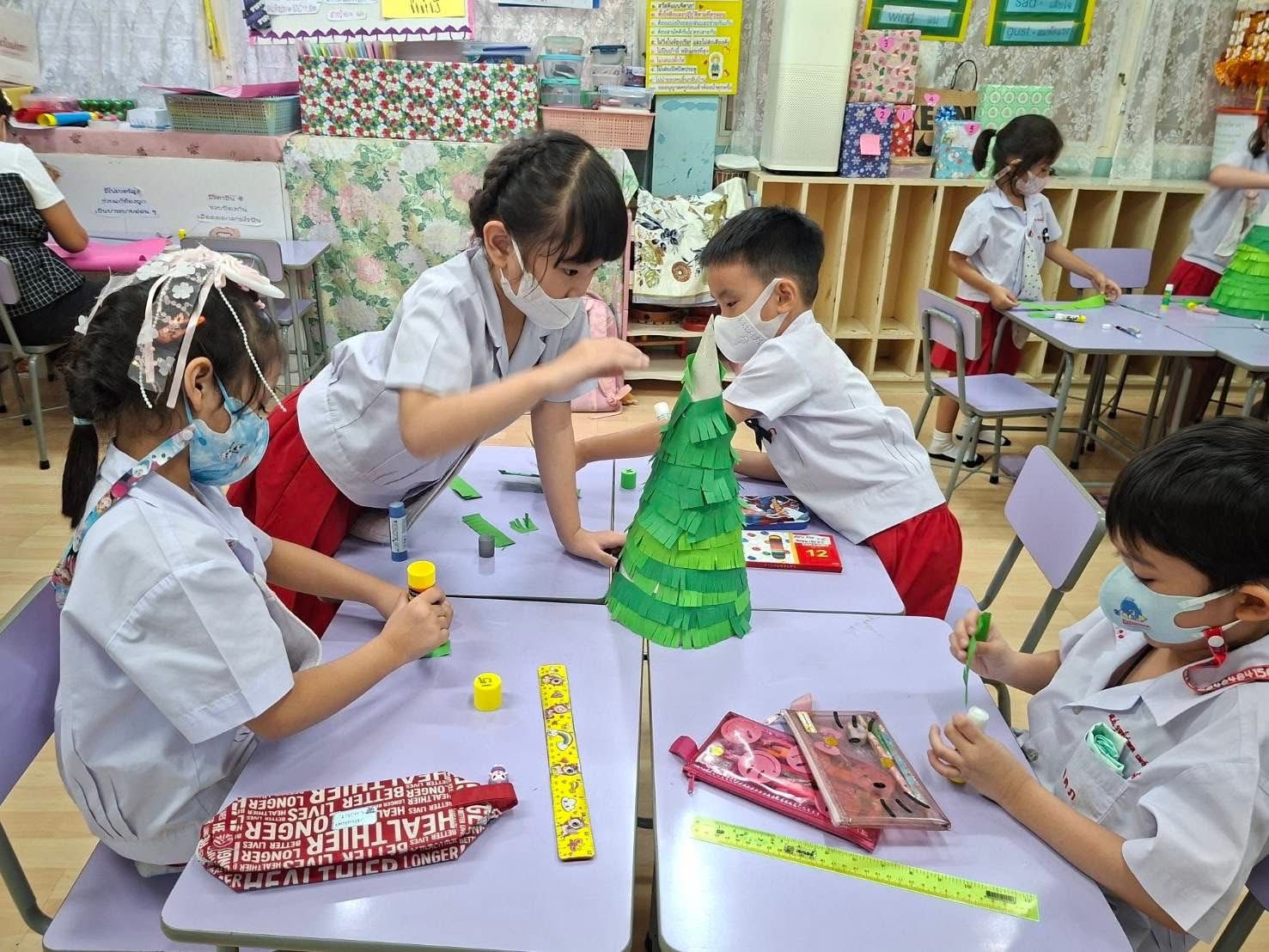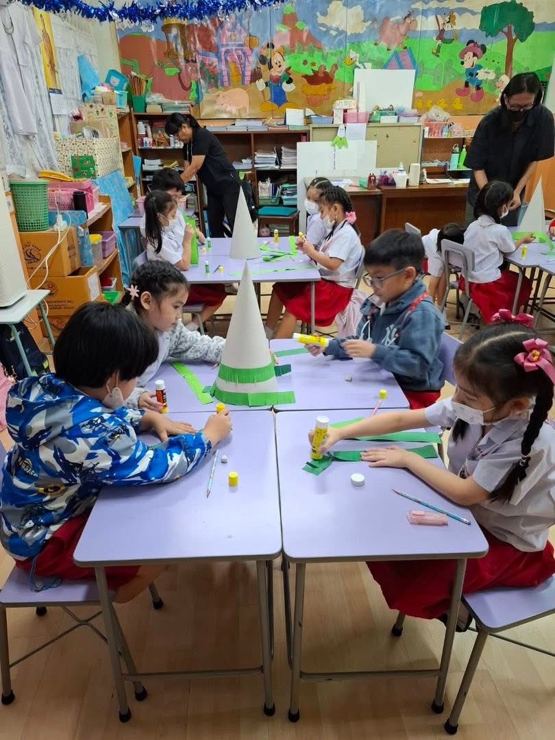 ชั่วโมงศิลปะอาทิตย์นี้ ครูโจ้ให้เด็กๆ แบ่งเป็นกลุ่ม ทำต้นคริสต์มาส โดยใช้สีไม้ในการตกแต่ง กำลังแสดงหน้าที่ « Previous 2/2 1 2