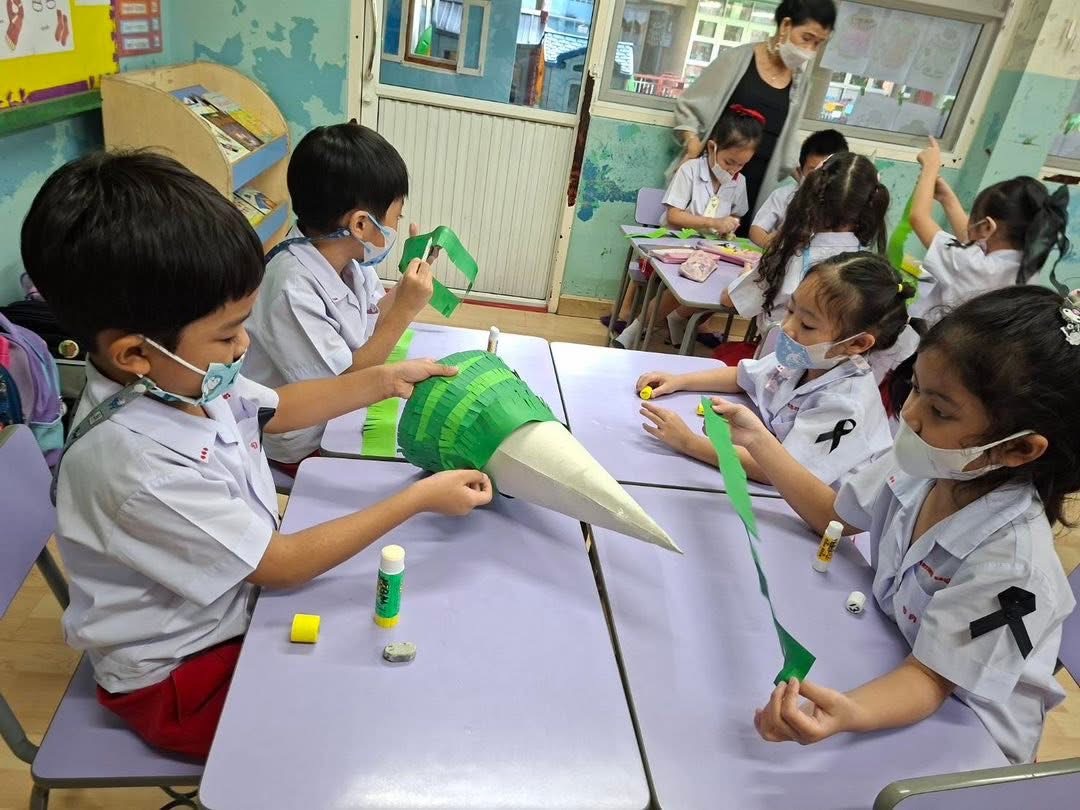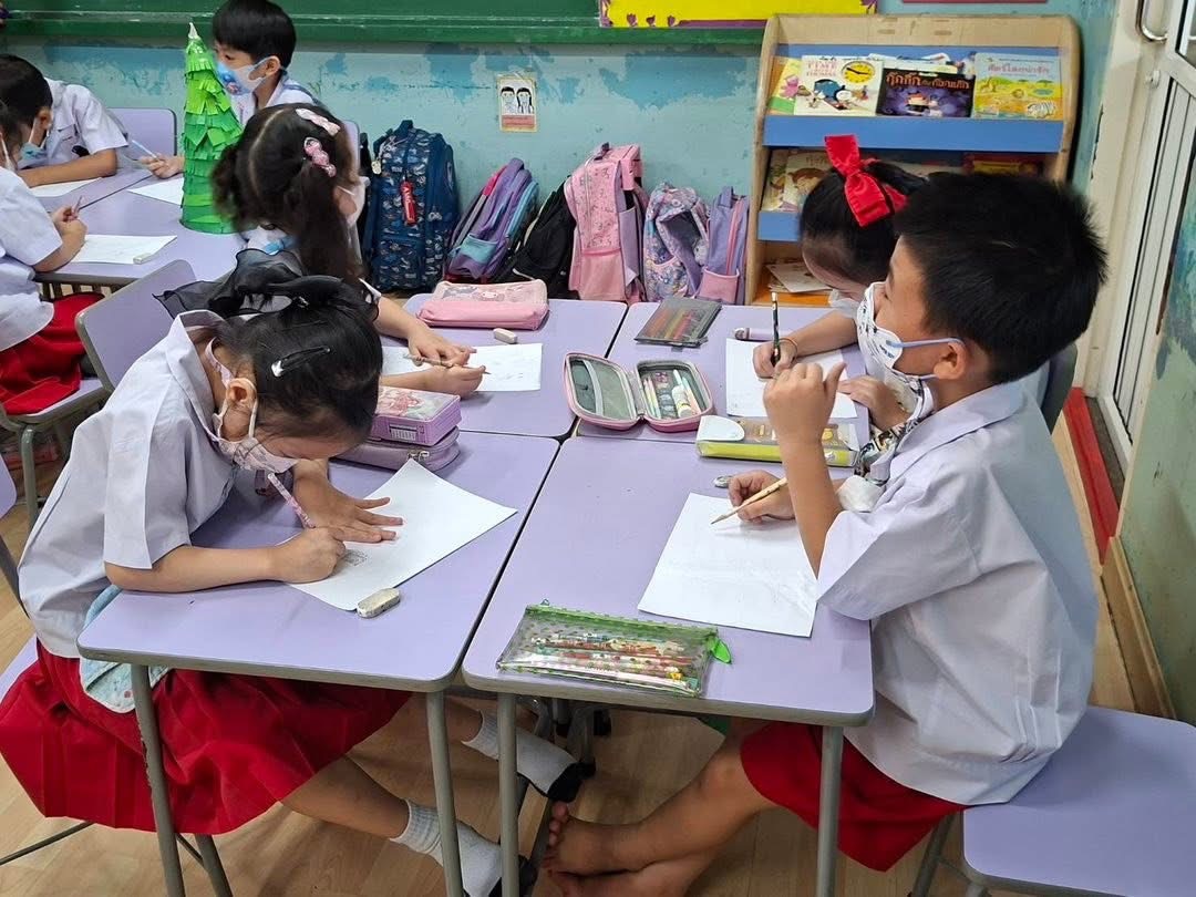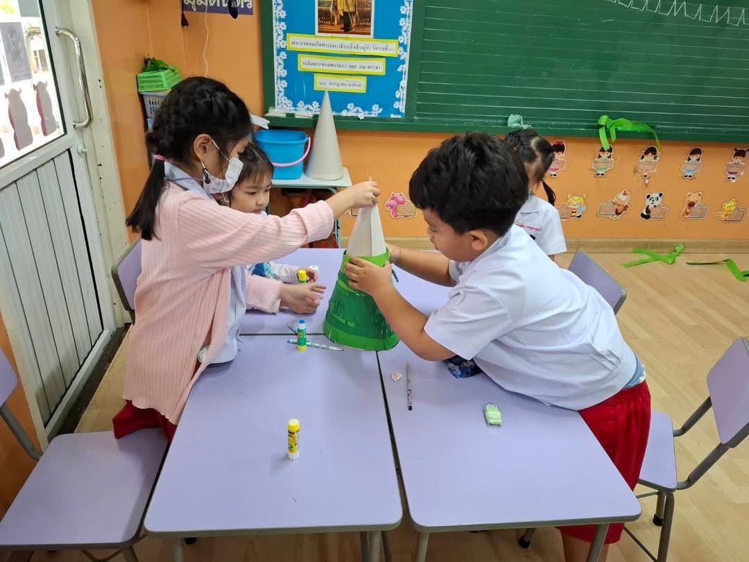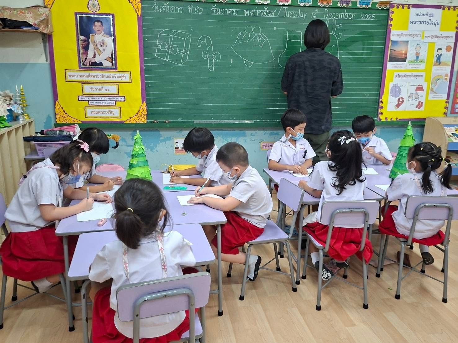 ชั่วโมงศิลปะอาทิตย์นี้ ครูโจ้ให้เด็กๆ แบ่งเป็นกลุ่ม ทำต้นคริสต์มาส โดยใช้สีไม้ในการตกแต่ง กำลังแสดงหน้าที่ « Previous 2/2 1 2
