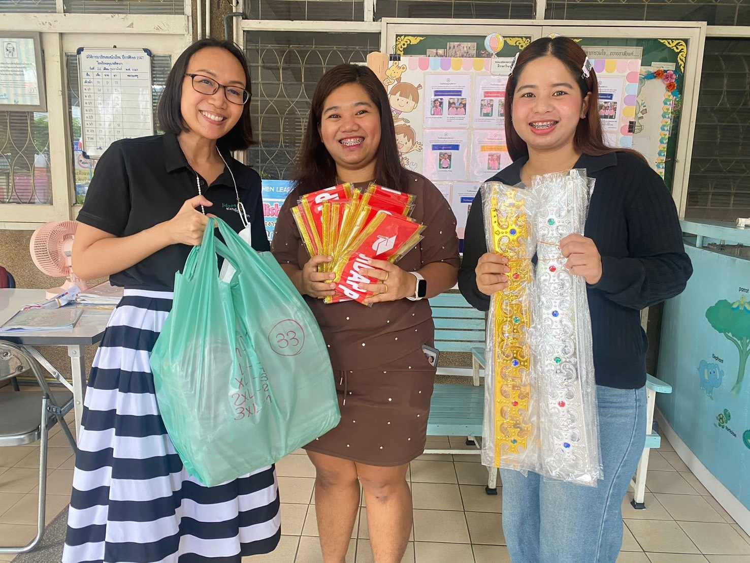 คุณแม่น้องธันวา ชั้น อ.3/2 และครอบครัว ทำเสื้อลายนักเรียนจิดาภารุ่นที่ 40 มาให้คุณครู พี่เลี้ยง บุคลากร และนักเรียนชั้นอนุบาล 3 ทุกคน และนำสายสะพายและมงกุฎมาให้เด็กๆ ชั้นอนุบาล 3 ทุกคน ขอขอบพระคุณมากนะคะ กำลังแสดงหน้าที่ 1/1 1
